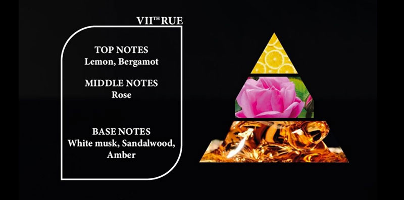 "VII ᵗʰ Rue" este destinat celor care cauta o experienta olfactiva sofisticata si rafinata, in care prospetimea luminata se imbina cu senzualitatea florala si caldura lemnului de santal. Acest parfum devine astfel o declaratie olfactiva a elegantei urbane, capturand esenta unui stil de viata sofisticat si modern.
